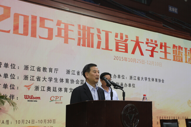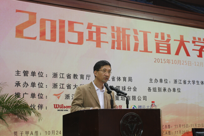 浙江大学副校长严建华致欢迎辞。他介绍了浙江大学蓬勃发展的篮球运动和学校篮球队所取得的优异成绩,并表示,将积极配合省教育厅和省大学生体育协会,为参赛运动员搭建起大显身手的舞台,希望运动员们能在切磋球技之余,增进友谊,加强交流,共谱浙江高校篮球运动事业的新篇章。