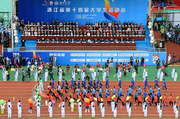 “青春是你高擎的火炬,运动是我快乐的源泉。”11月10日上午,随着会歌《蔚蓝青春》在温州大学北校区唱响,浙江省第十四届大学生运动会隆重开幕。 来自我省78所高校的93支代表队9300多位运动员、教练员、裁判员欢聚温州,参与田径等赛事的激烈角逐。 开幕式以“阳光·启航”为主题,分《看青春跃上赛道》、《让梦想扬起》等六个节目环节,舞美创意凸显当代青年学子青春律动,既体现省大运会的特点和主题,又充分表达瓯越文化的底蕴和内涵。 值得一提的是,这次开幕式运动员的入场式很有新意,运动员通过骑自行车和跑步的方式宣传绿色出行的环保理念。