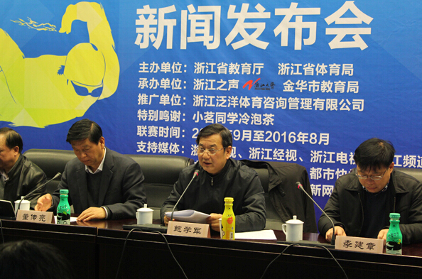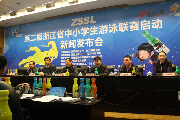 3月4日,浙江省第二届中小学生游泳联赛在浙江广电集团召开新闻发布会,宣传推广我省开展阳光体育运动,推动中小学生普及游泳运动,提高自救能力。