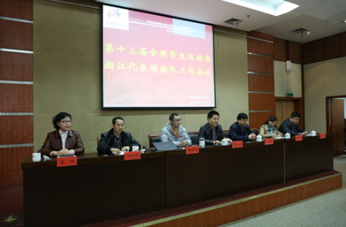3月29日下午,第十三届全国学生运动会浙江代表团组队工作会议在浙江理工大学行政楼二楼报告厅举行。浙江理工大学党委副书记周文龙,浙江省教育厅体卫艺处处长李建章,浙江省体育职业技术学院科研处处长、省反兴奋剂中心副主任韩照歧,浙江省体育局青少处调研员马素萍,浙江省教育厅体卫艺处干部沈叶庆,浙江省大学生体育协会秘书长姜丽,浙江省中学生体育协会秘书长华云飞等领导出席会议。同时,浙江省大、中学生各项目男女代表队领队、教练,省大学生体育协会竞赛部、教学科研部、外联开发部、纪律监察与培训部,省大、中学生体育协会各分会秘书长、副秘书长,全体参赛教练员以及各承办学运会学校体育部主任等70多人参加会议。会议由浙江省教育厅体卫艺处干部沈叶庆主持。